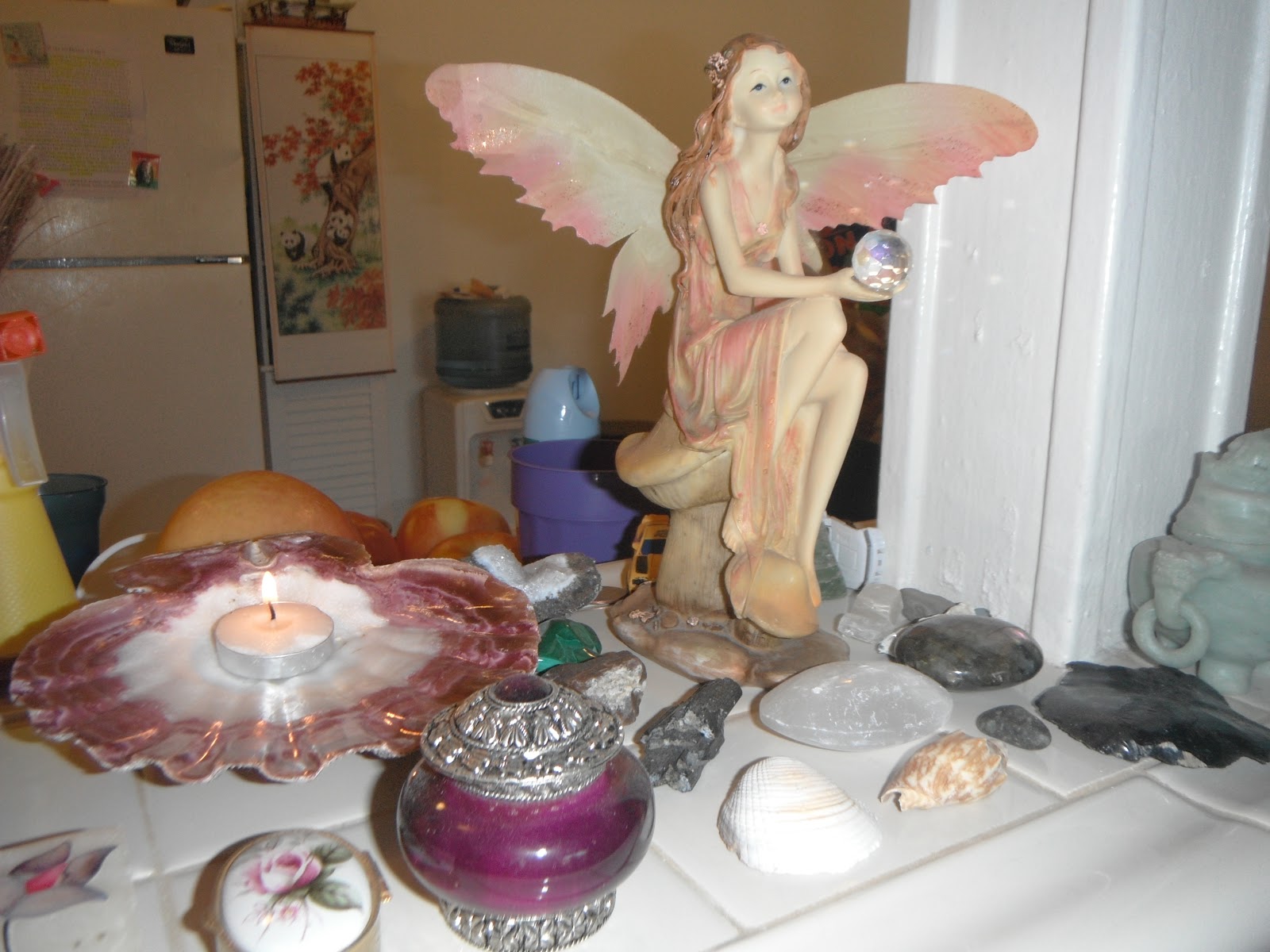 It includes little nicknacks I find threw-out the years. Crystals always play a part in my altars and sea shells.